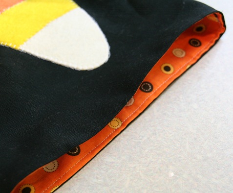 I think I made my applique candy corn bigger than your example, so that when I centered it on my fabric and then made the corners, the applique image is then sitting on the very edge of the bag. So, I just wanted to stress about putting the applique up high enough so that the image doesn't end up under the bag when you make the bottom.
