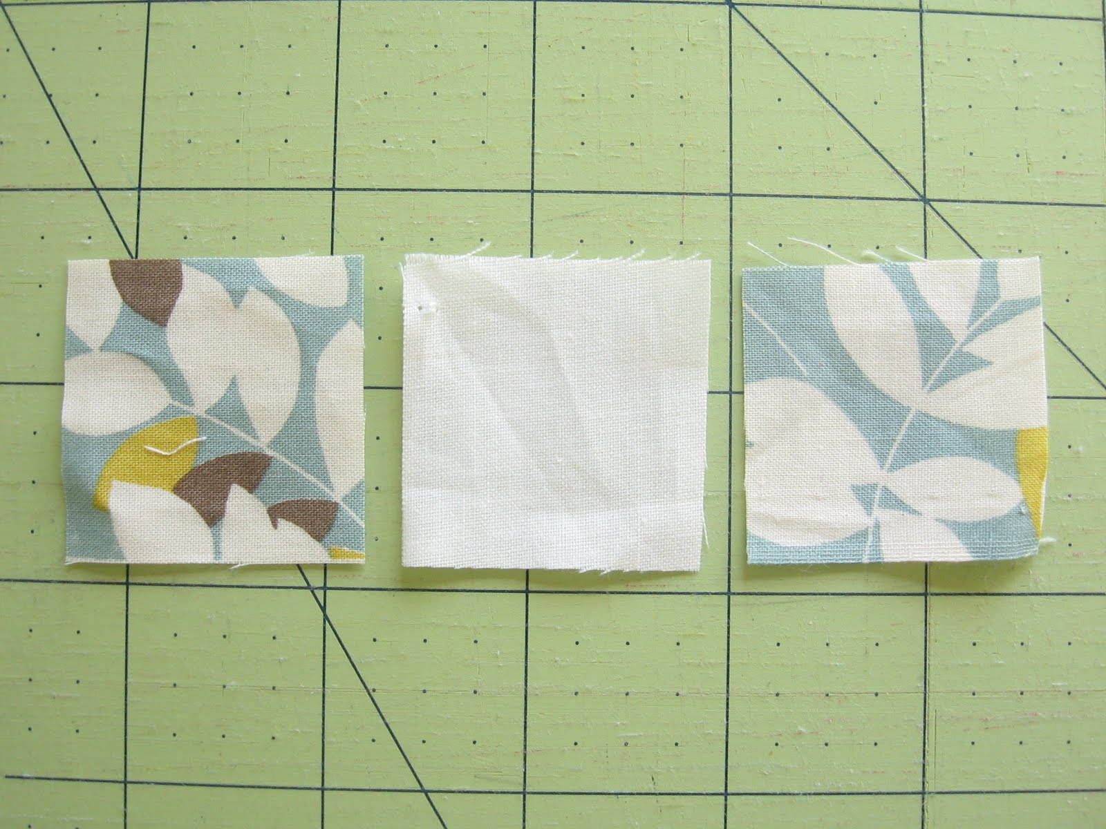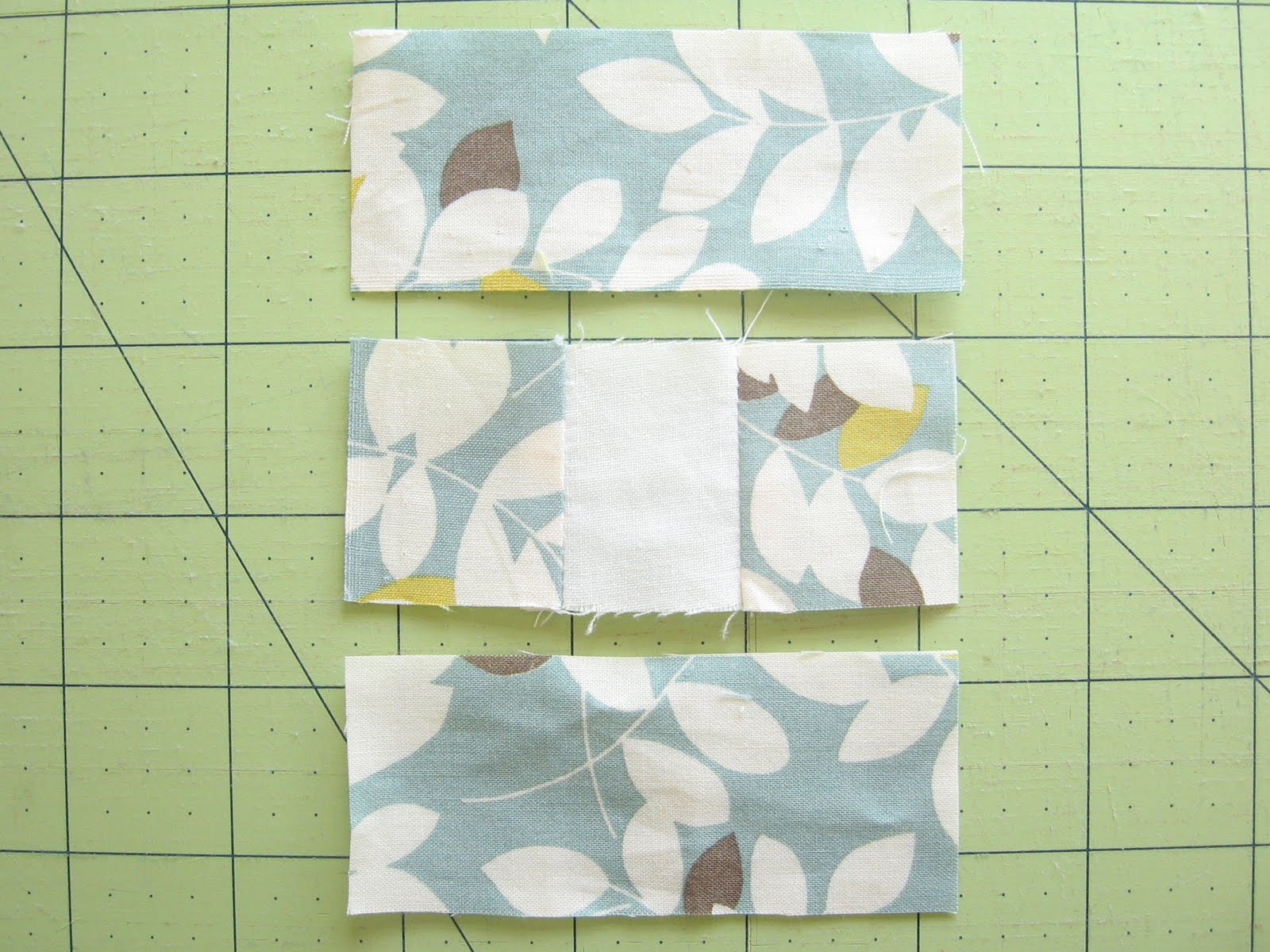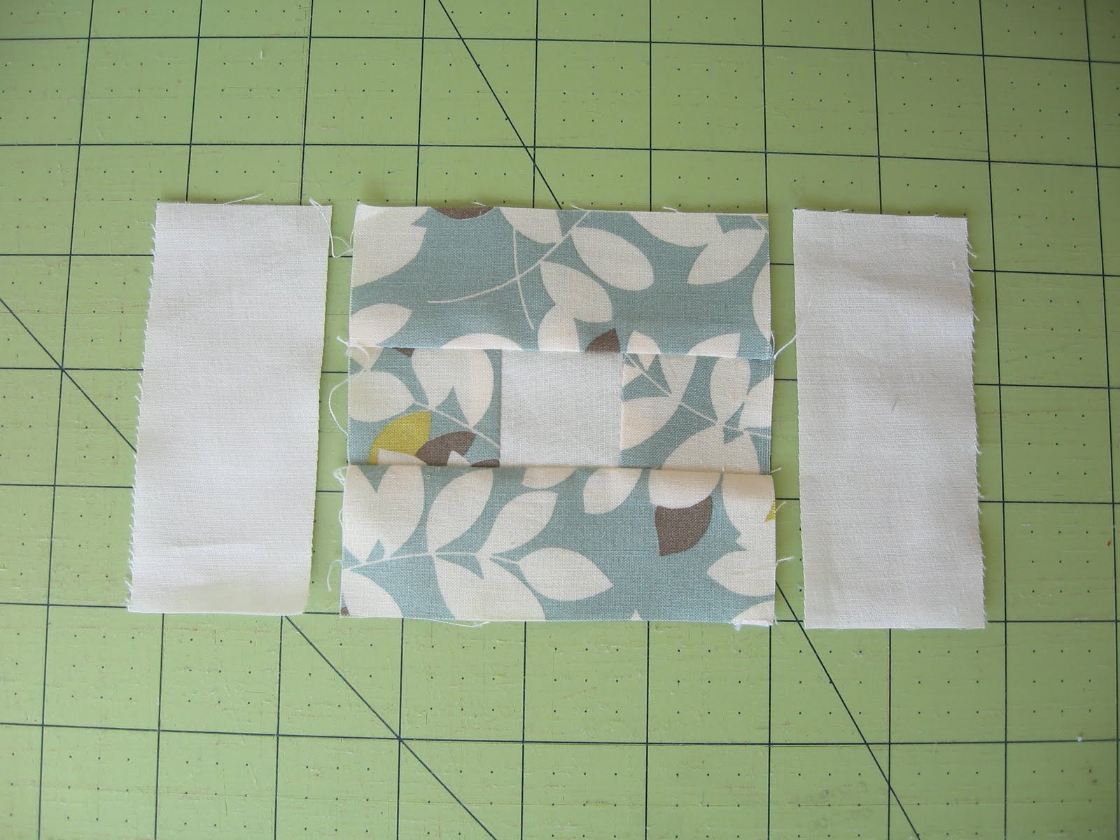 1. Stitch the two printed 1.5" pieces to the sides of the 1.5" neutral piece. Press seams toward the print.
