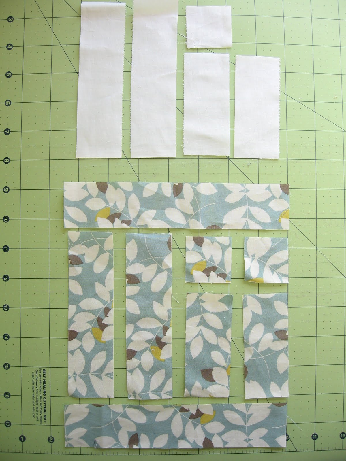 2- 3.5" x 1.5" strips 2- 5.5" x 1.5" strips 2- 7.5" x 1.5" strips Neutral Fabric: 1- 1.5" x 1.5" square 2- 3.5" x 1.5" strips 2- 5.5" x 1.5" strips